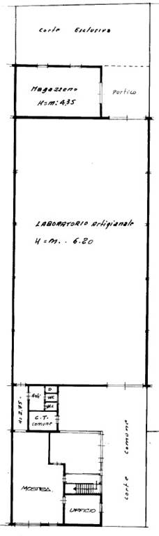 Disponiamo di un capannone artigianale (ex laboratorio di elettromeccanica) completamente indipendente con relativi uffici di pertinenza, altezza media 6,00 m, annesso magazzino di circa 60,00 mq (altezza 4,30 m), portico e diversi servizi igienici, spogliatoi e vari locali; piazzali e cortili per un totale di circa 200 mq.
